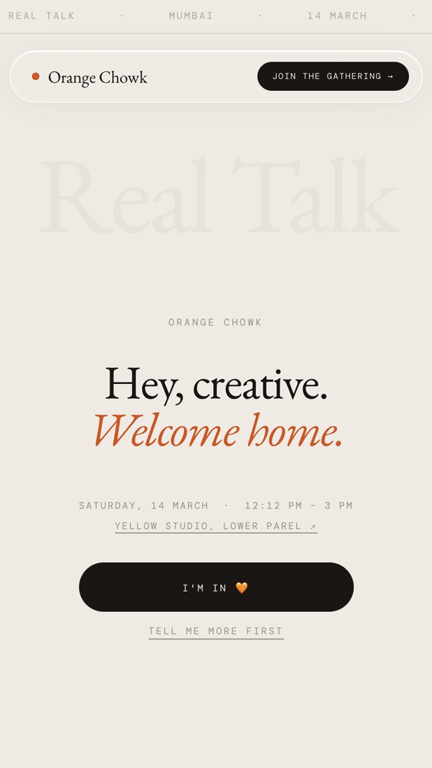 We designed the experience to feel inviting and effortless, allowing creatives to instantly connect with the intent of the gathering. Every element is kept simple and clear, so nothing gets in the way of the feeling. From the first glance to the final action, the journey remains smooth, intuitive and easy to step into.